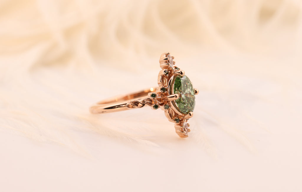 -Side/Accents: 3x1.5mm F+ lab diamond, 1mm dark green diamond