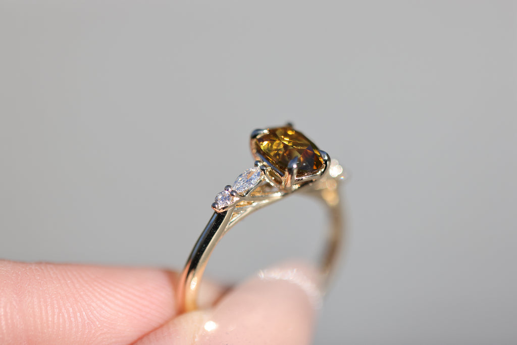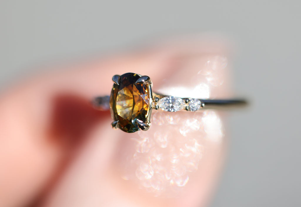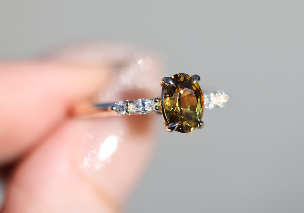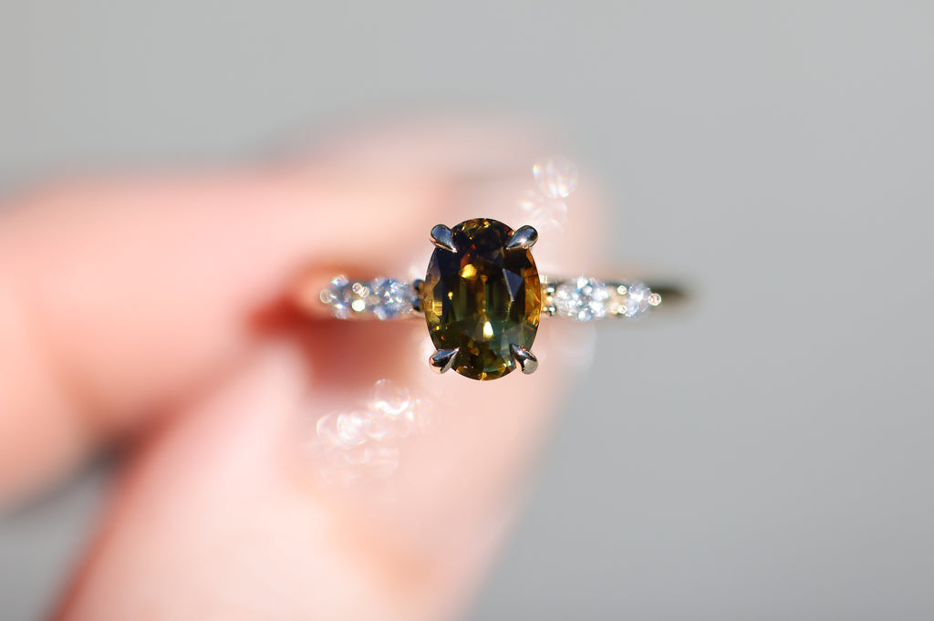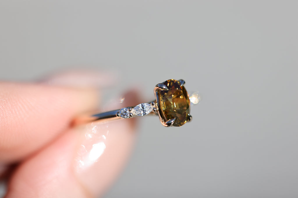 Center: 1.61ct oval orange green sapphire 8x5.8mm heated Madagascar