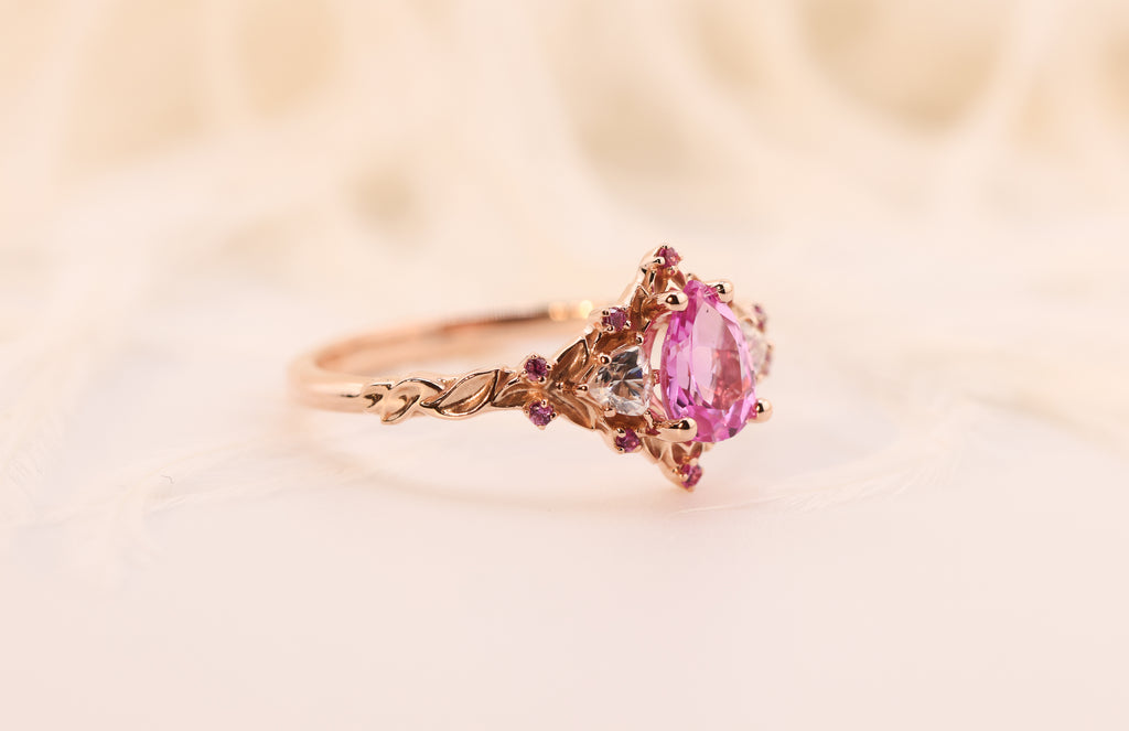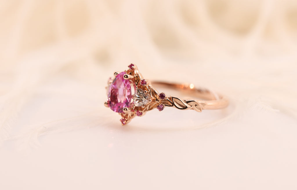 -Side/Accents: 3mm trillion moissanite, 1mm round pink sapphire