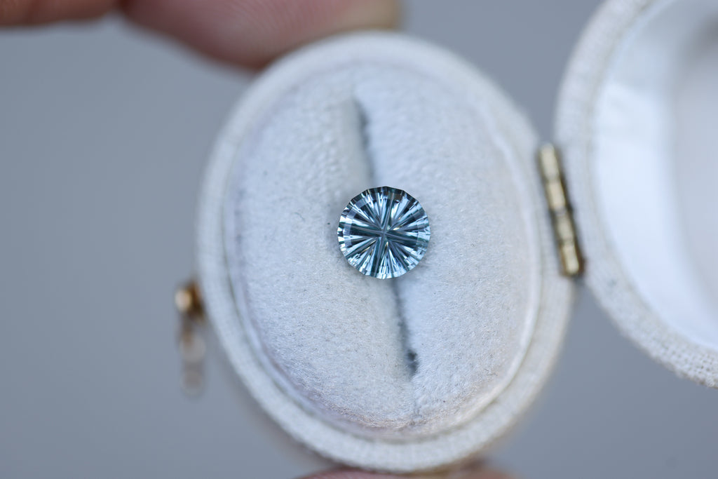 This stunning round sapphire is such a special color change that goes from blue outside to more purple inside! It is a custom Starbrite cut from award winning gem cutter and will make the most magical ring!
