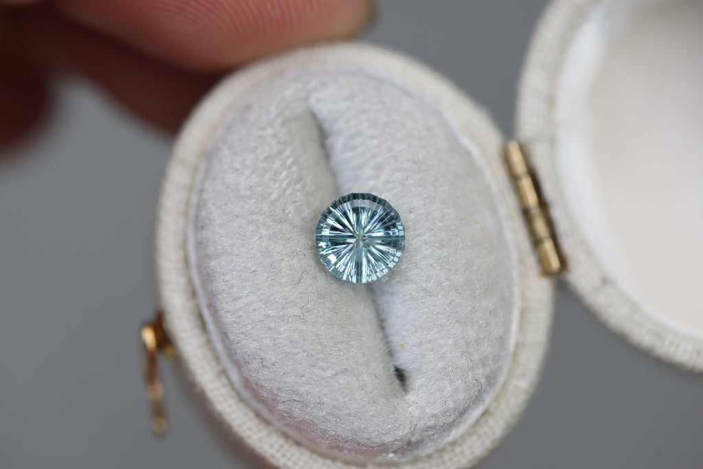 A stunning round icy light blue sapphire with award winning gem cutter John Dyer's incredible Starbrite faceting! Just a beauty!