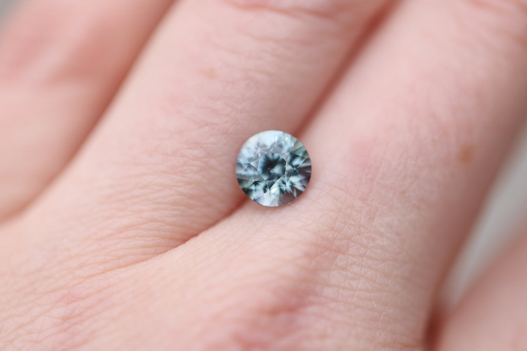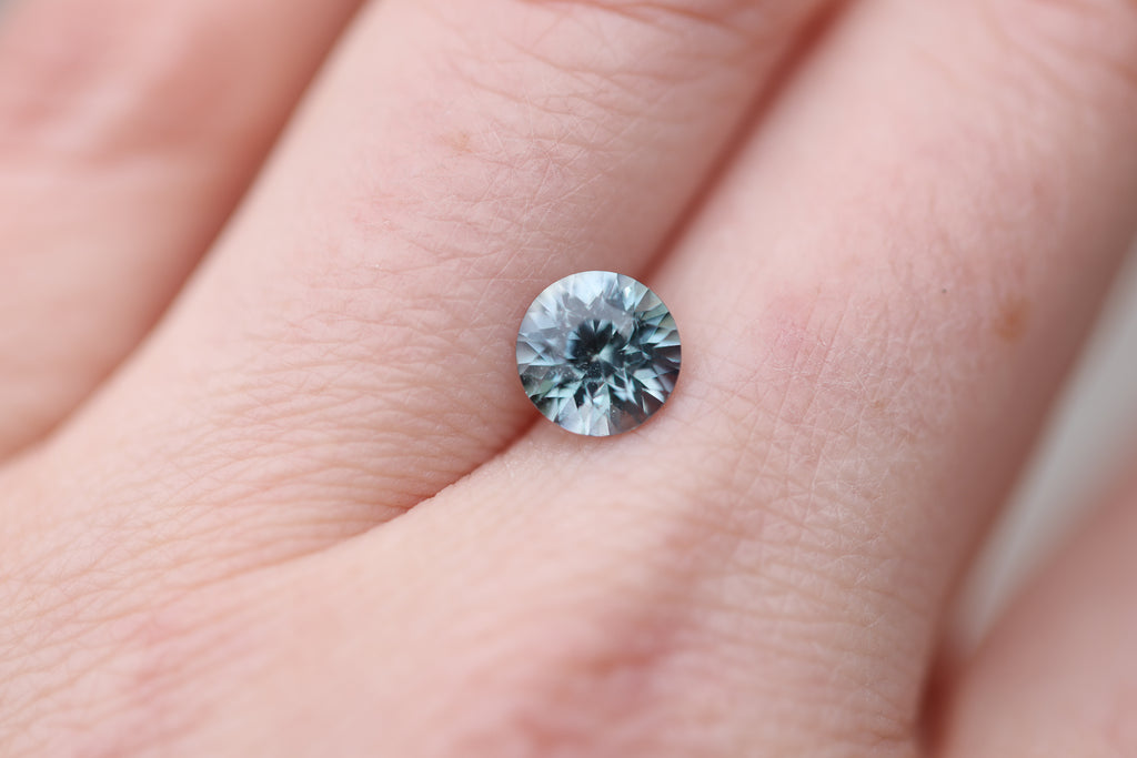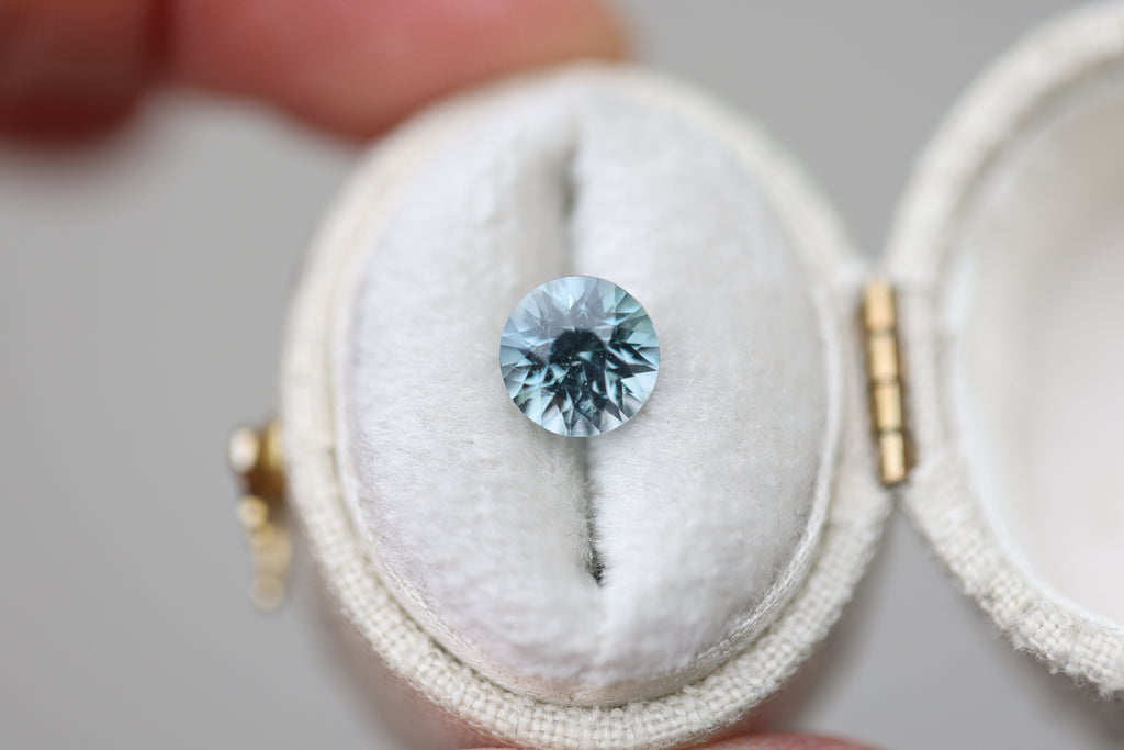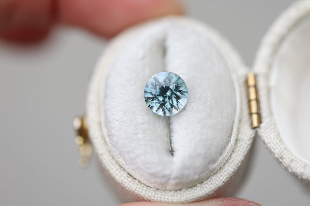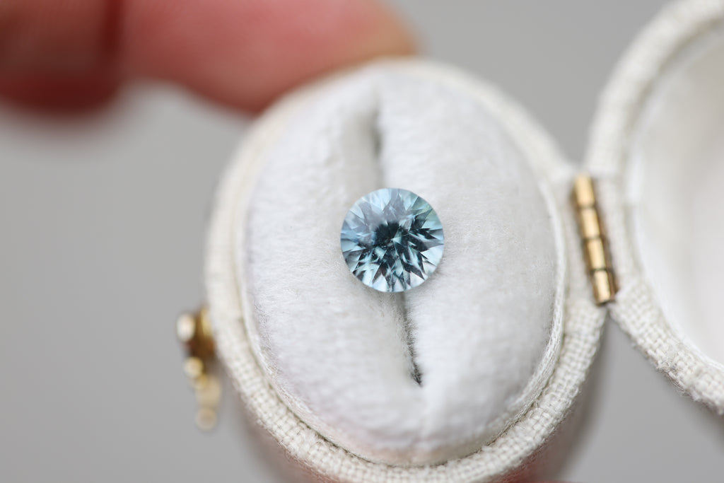 This beautiful round sapphire is the prettiest teal blue with such stunning faceting!
