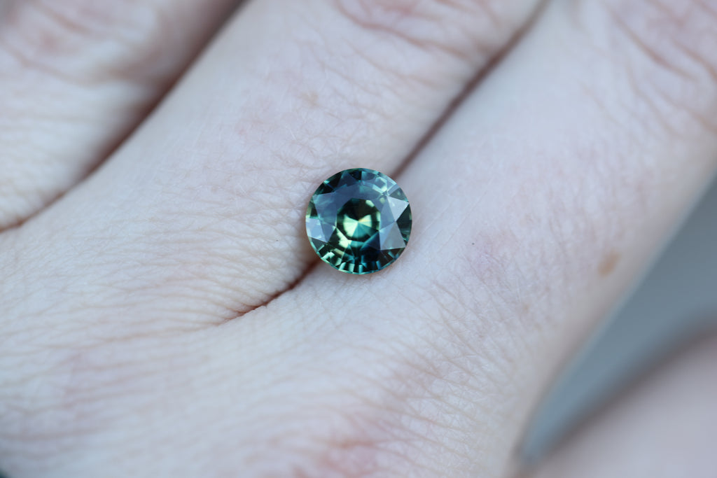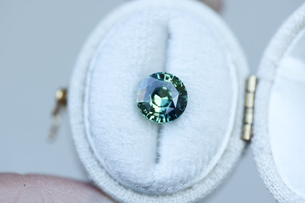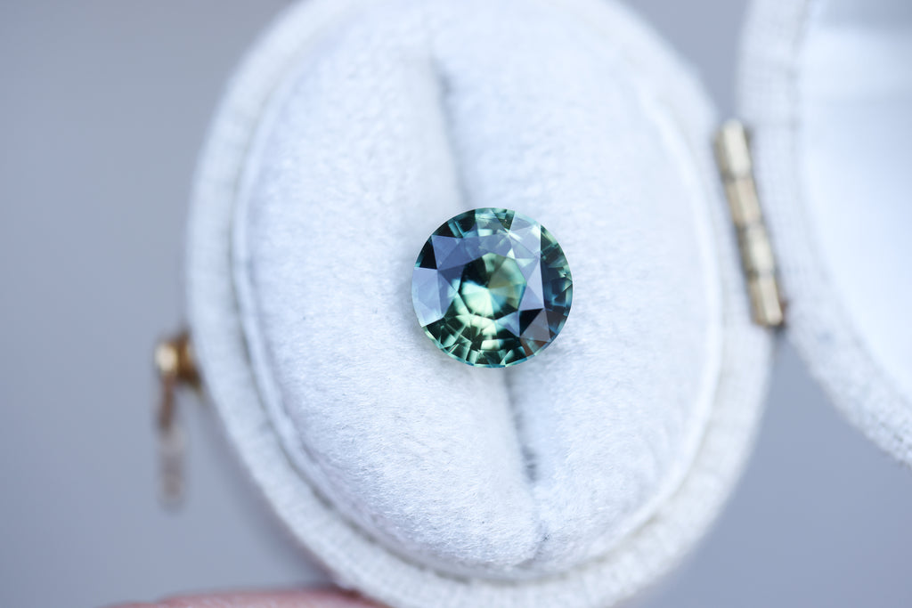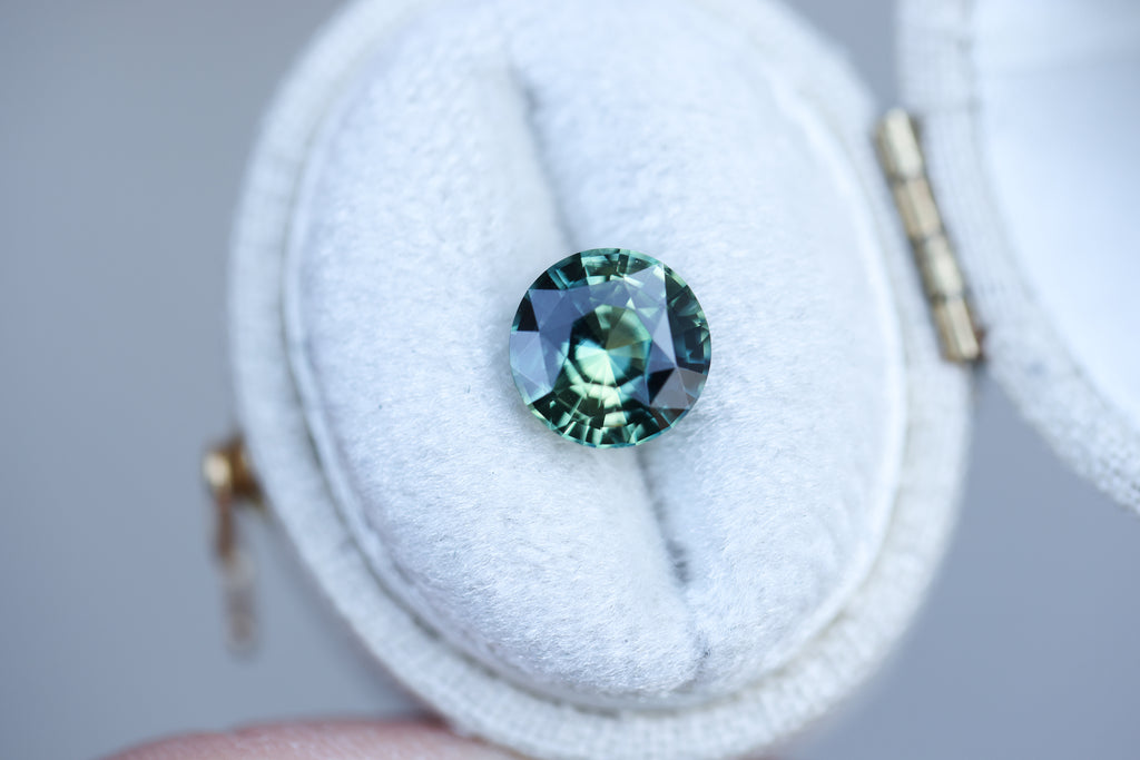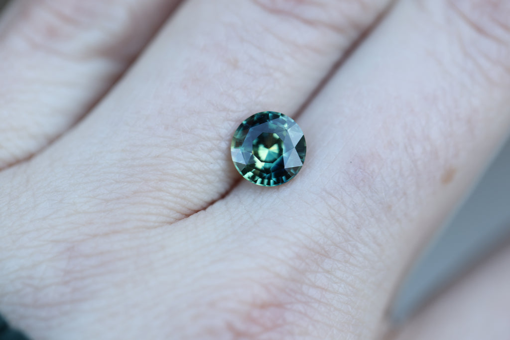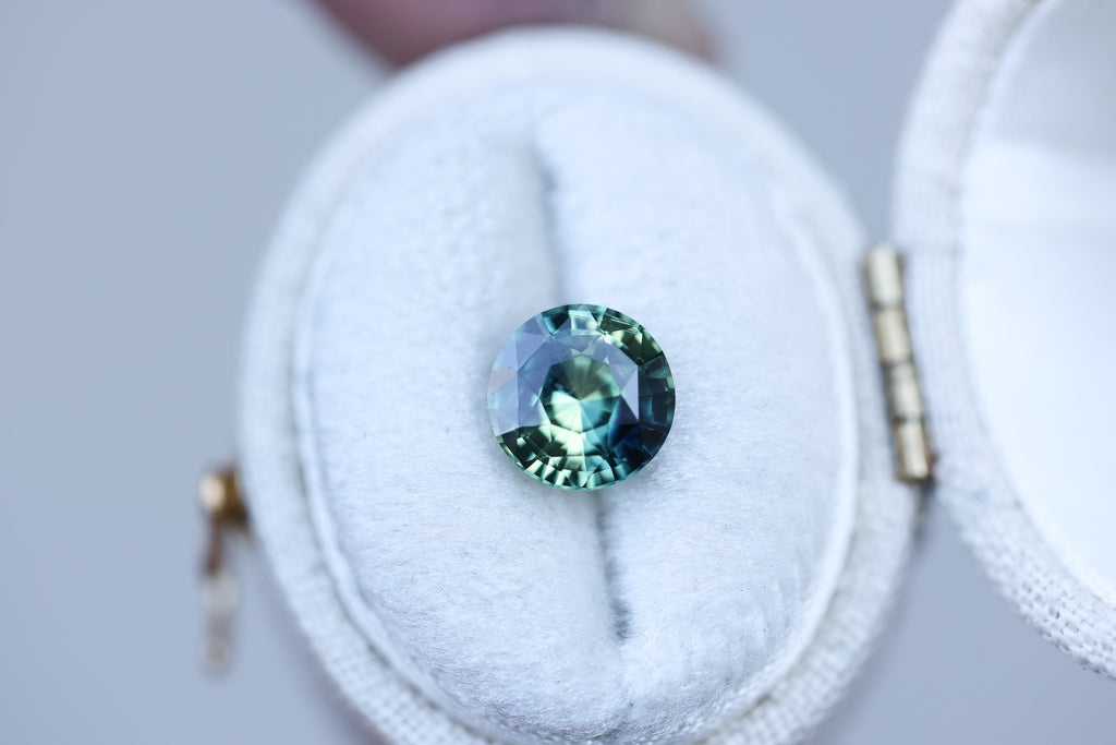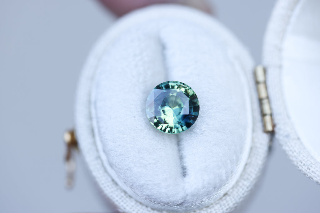 This incredible round parti sapphire is a stunning mix of green and blue! Just an absolute beauty that will make such a special one of a kind ring!