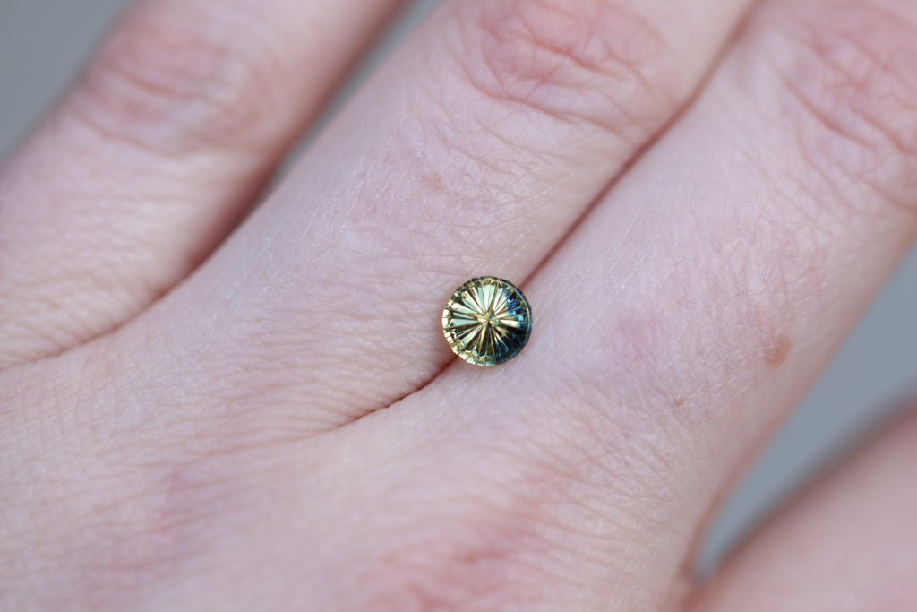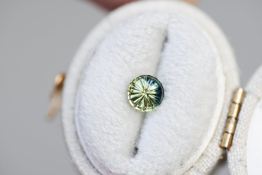 This gorgeous round parti sapphire is such a stunning mix of yellow blue and green! It is a custom Starbrite cut from award winning gem cutter John Dyer and will make such a beautiful one of a kind ring!