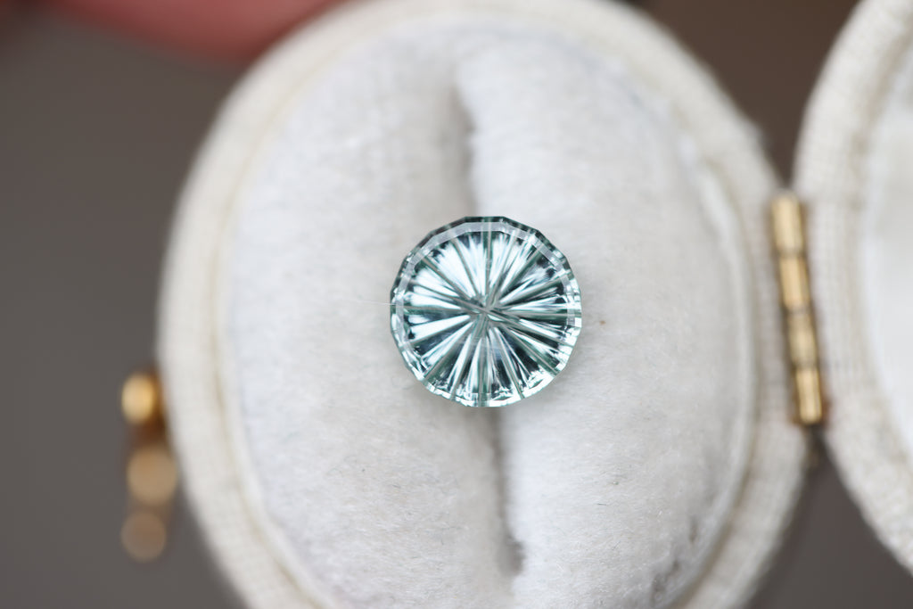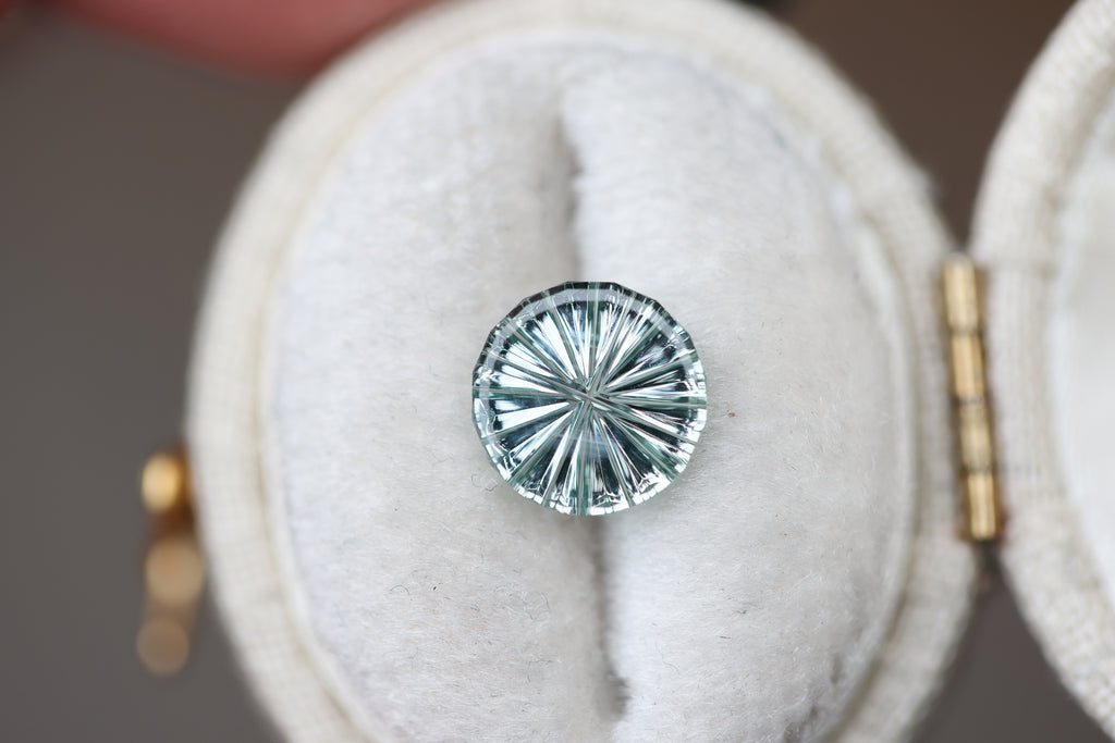 This absolutely stunning light blue green sapphire is such an icy beauty! It is a custom Starbrite cut by award winning gem cutter John Dyer and just an incredibly magical stone!