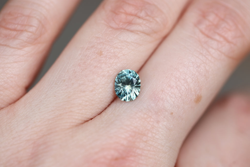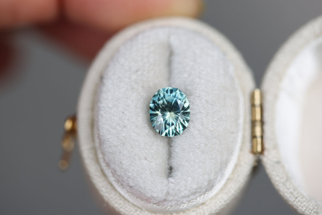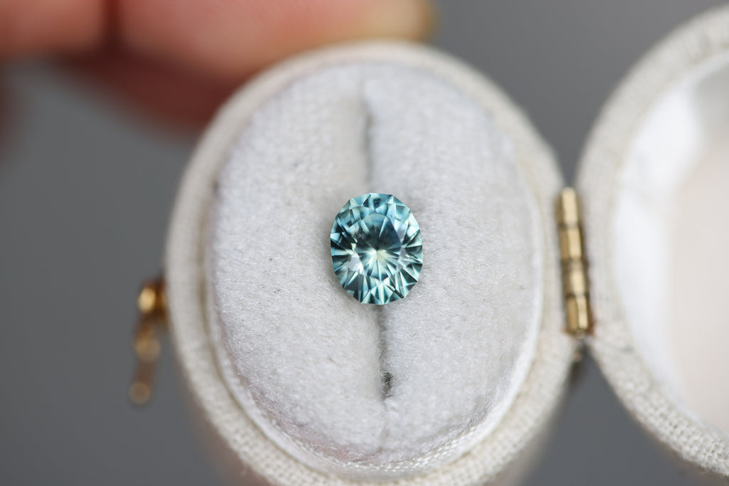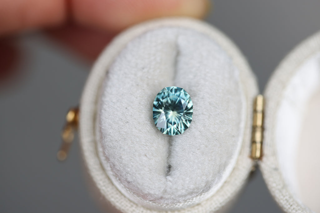 This gorgeous oval teal sapphire has such stunning rich coloring and the most incredible faceting!
