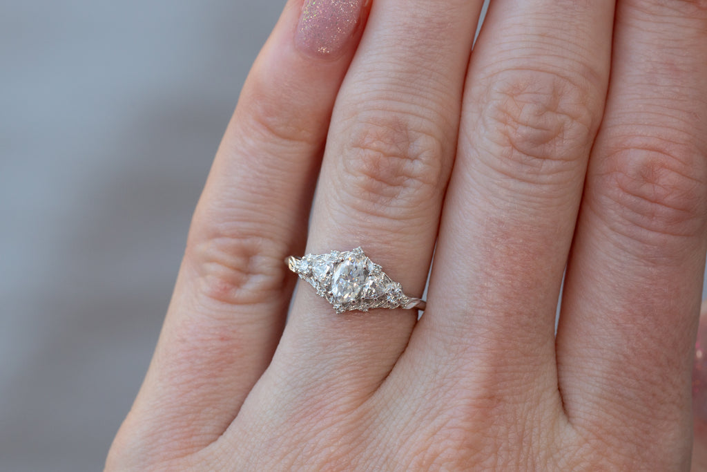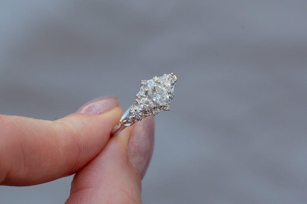 -Side/Accent Stones: 3mm trillion moissanite, 2mm lab diamond, 1mm lab diamond