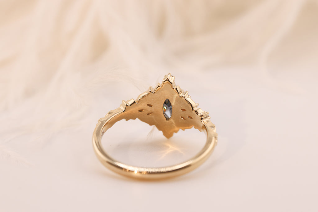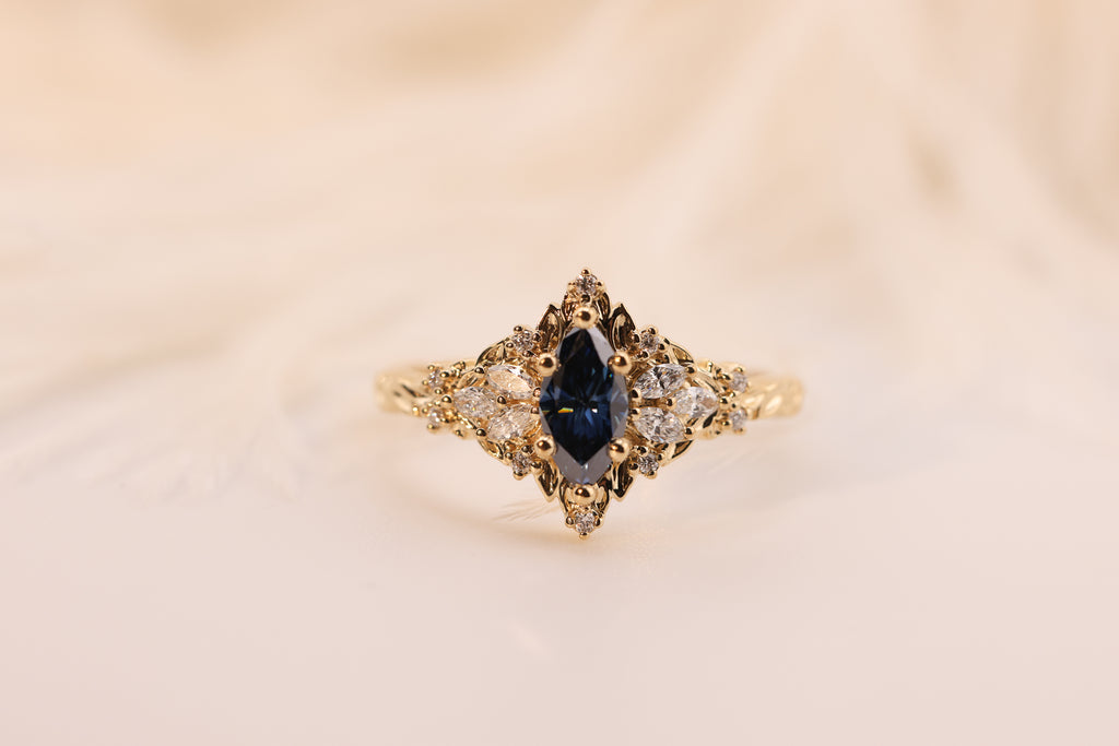 -Side/Accents: 3x1.5mm marquise lab diamond, 1mm round lab diamond