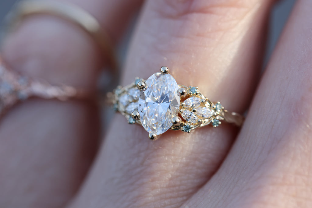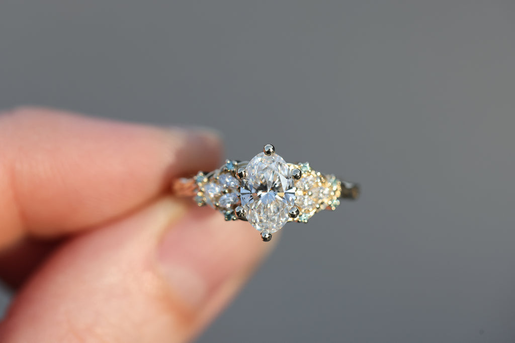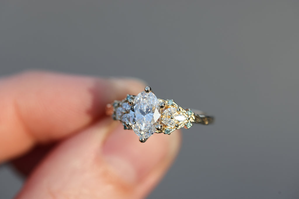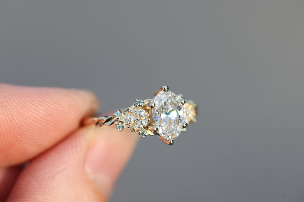 -Sides/Accents: 3x1.5mm lab diamond, mint diamond