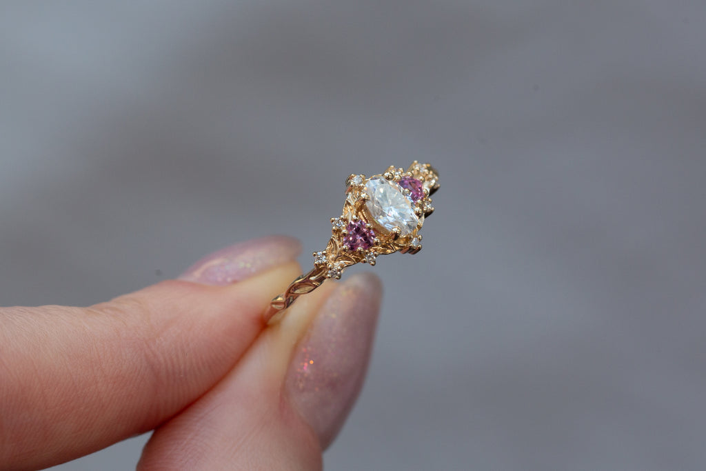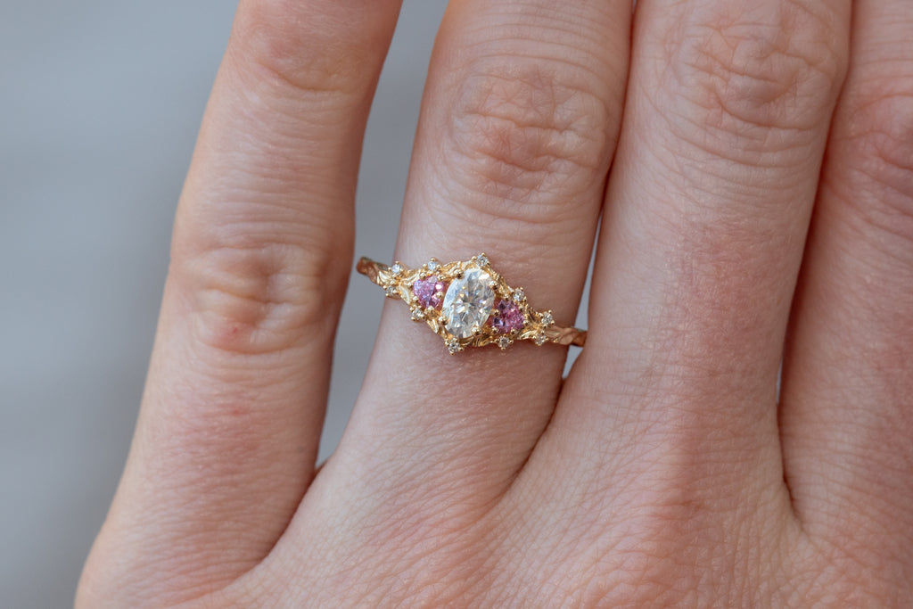 -Side/Accent Stones: 3mm trillion lab pink sapphire, 1mm lab diamond
