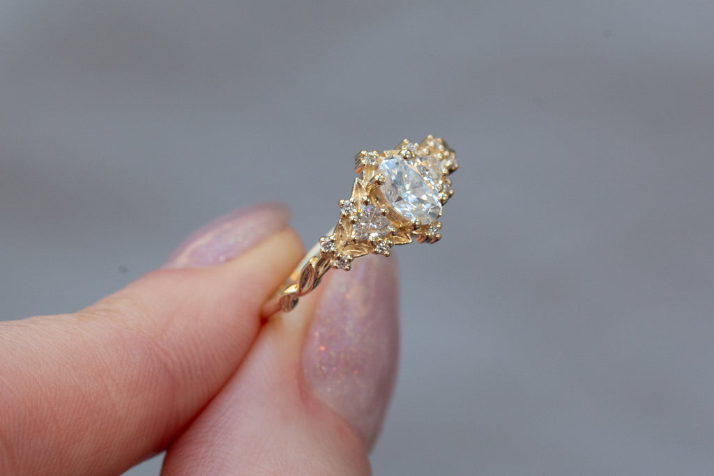 -Side/Accent Stones: 3mm trillion moissanite, 1mm lab diamond